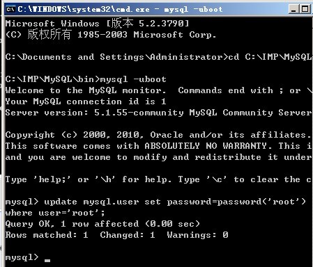 6.改密码:> update user set password=password("123456") where user="root"; (别忘了最后的分号)