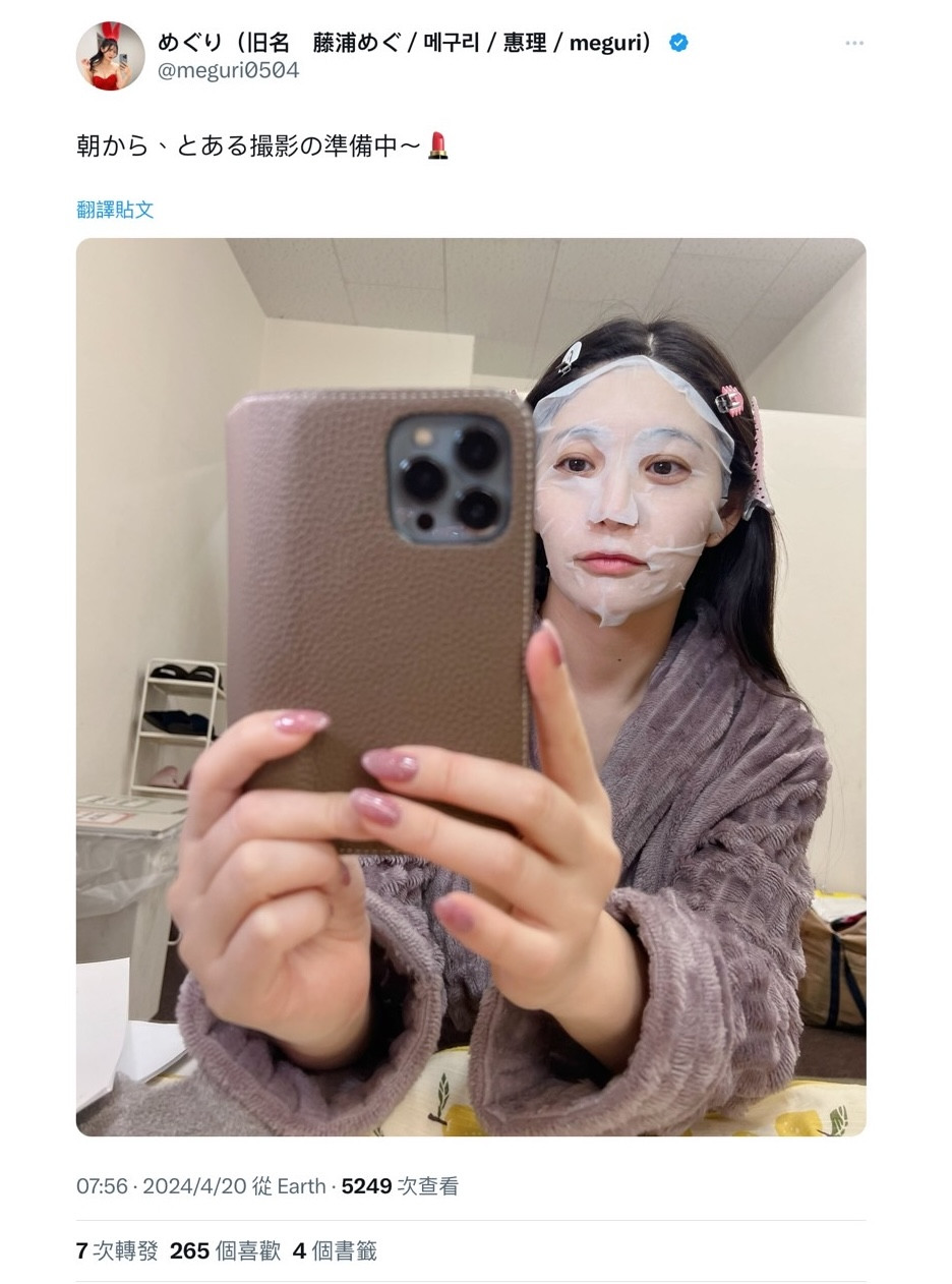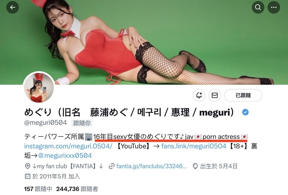 可能有人会以为めぐり(惠理)引退了,这个とある撮影指的未必是拍A片,但你只要到她的X(https://twitter.com/meguri0504)就知道她从来没说自己引退了,在自我介绍她是写说「16年目sexy女優のめぐりです(第16年的AV女优惠理)」,意思就是虽然她很久没拍片了但仍然是「现役」,她不是忘了改,而是从来不认为自己离开惹: