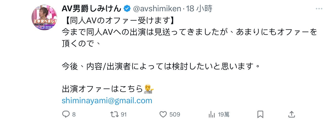 在公开AV男优不同等级的收入数字后,しみけん(清水健)昨天又在X(https://twitter.com/avshimiken)上拋出震撼弹,他说自己收到很多同人AV的邀约,但之前他从来没答应合作,但因为邀约实在太多了,所以现在他会视拍摄的内容以及合作的对象来考虑是否合作,有兴趣的业者可以Email给他〜很文博客-https://www.hinku.com/58774.html