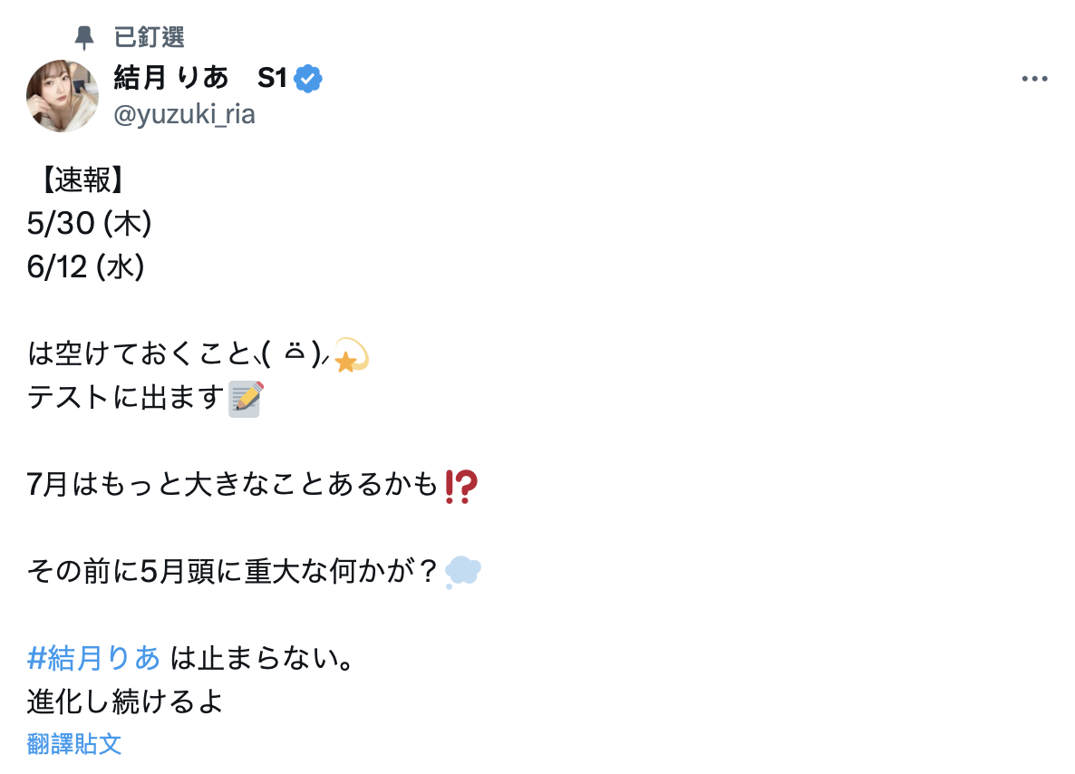 其实没有,就经纪公司的说法是她的新片情报即将解禁,只是目前没办法曝光;結月りあ(结月莉亚)也在X(https://twitter.com/yuzuki_ria)的置顶贴文说5月初和7月都会有大事宣布,同时她也强调自己永不停息、还在进化: