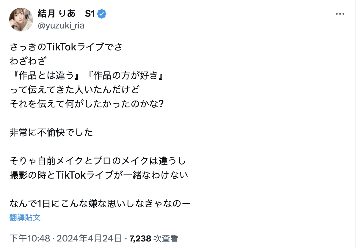 这话不用我翻译了,結月りあ(结月莉亚)说自己化妆和专业化妆出来的感觉就是不一样,Tiktok直播和摄影也是截然不同,为什么自己要被那些留言搞得那么不愉快?很文博客-https://www.hinku.com/58978.html