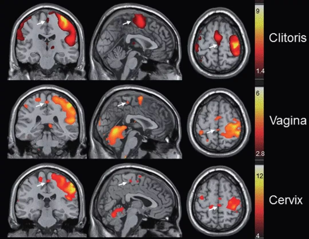 索性大脑是诚实的。实验里,专家们请来了因为脊柱瘫痪导致阴蒂完全无感(即无法传送阴蒂感受到脑部)的女士。她的脑部图像显示,她同样达到了高潮。