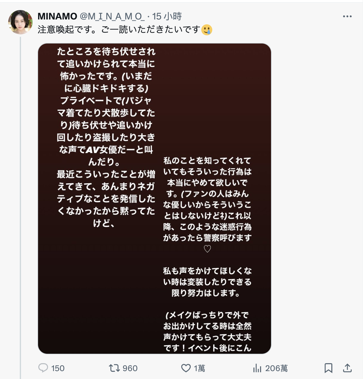 再来,看得懂日文的朋友应该都注意到MINAMO有说那些害自己受惊的人们不是粉丝,她的粉丝才不会做那么失礼的行为ー这句话其实只对了一半,因为最容易吓到女优的除了那些无礼人之外就是那些爱她们爱到骨子的「铁粉」,私底下和很多女优聊天时她们会告诉你铁粉才是压力的来源,这些粉丝因为太爱女优所以会想办法探听出有关女优的一切,去女优去过的地方吃女优喜欢的餐点而还拍照上传社群,对女优来说那和跟踪狂没两样了〜