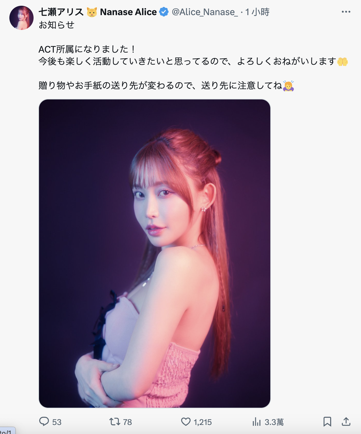 于是在以「可以参加TRE」为前提下,七瀬アリス(七濑爱丽丝)与ACT达成了加盟的共识,接下来不只是TRE、台湾摄影会也有谱了,再加上之前三社专属的合约也没变,现在可说是她生涯的最高峰ー