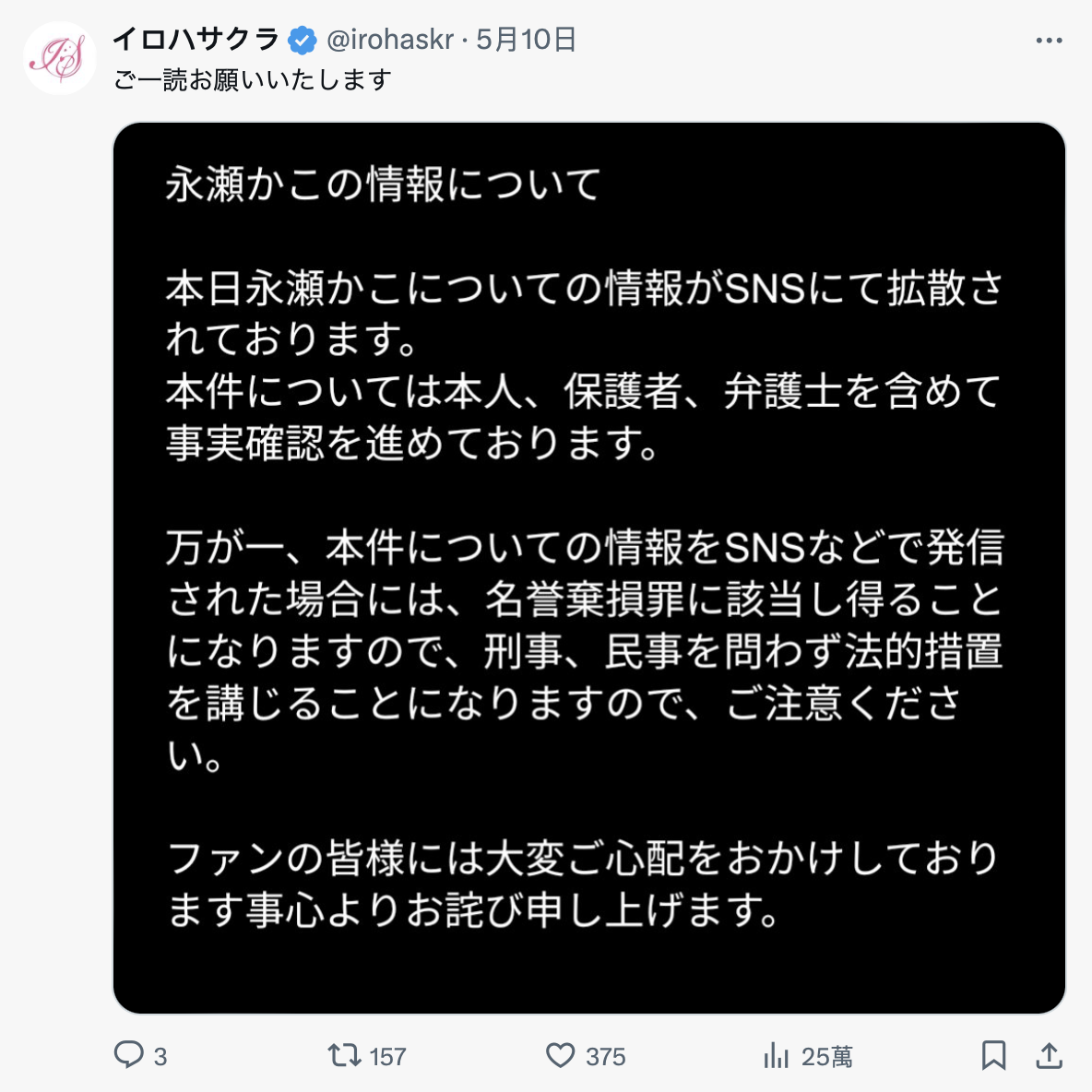 我们已经注意到永瀬かこ(永濑加子)的情报在社群上快速扩散,目前正和本人及其监护人还有律师进行确认,请不要随便传播那个讯息,否则可能会构成诽谤罪,我们会针对刑事和民事的部分採取法律行动!