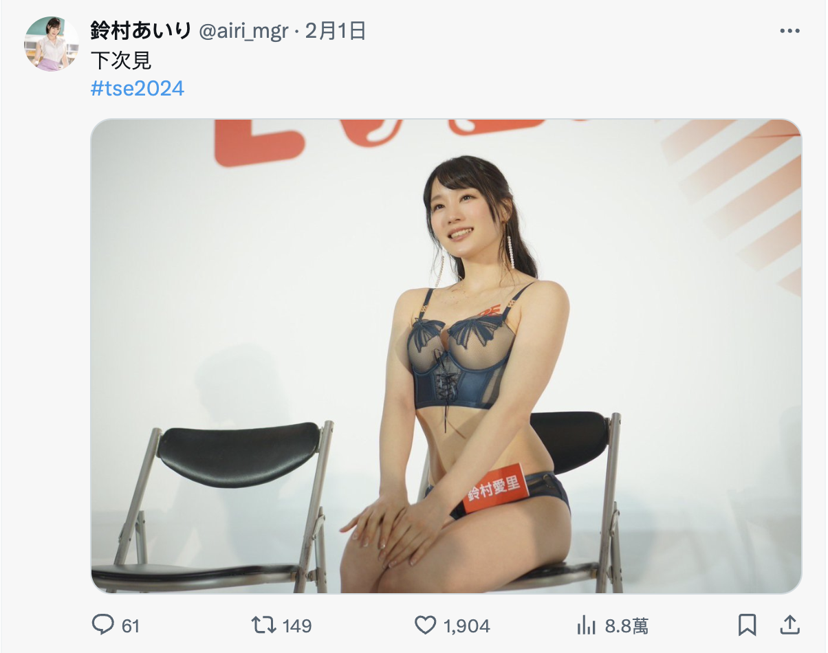 这也说明了凉森和铃村在TSE的表现好到主办单位无法忽视他们。最后就是鈴村あいり(铃村爱里)自己的想法了,当初她参加TSE时除了「想变有名」、「想看看自己在海外的人气」的念头外多少也是经纪公司在后面推屁股要她出来的味道,所以在沟通上难免有些卡卡的,活动前我们也很担心害羞的她无法承受台湾粉丝的热情⋯