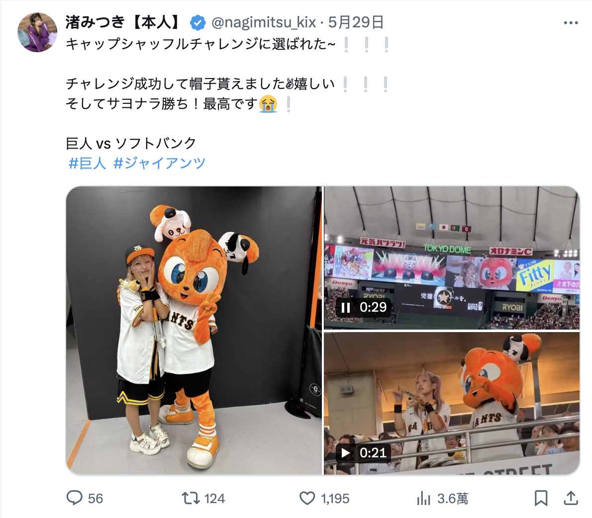 她自己也很兴奋,在自己的X(https://x.com/nagimitsu_kix)不但放上了与吉祥物的合照还上传了当时被大萤幕特写的画面,显然觉得挺光荣的ー至于你说巨人队会不会觉得特写到前AV女优很糗呢?我觉得应该是还好啦,因为也不是什么大不了的事,甚至还有作品直接就设定女优是日本ハム(日本火腿)的球迷⋯
