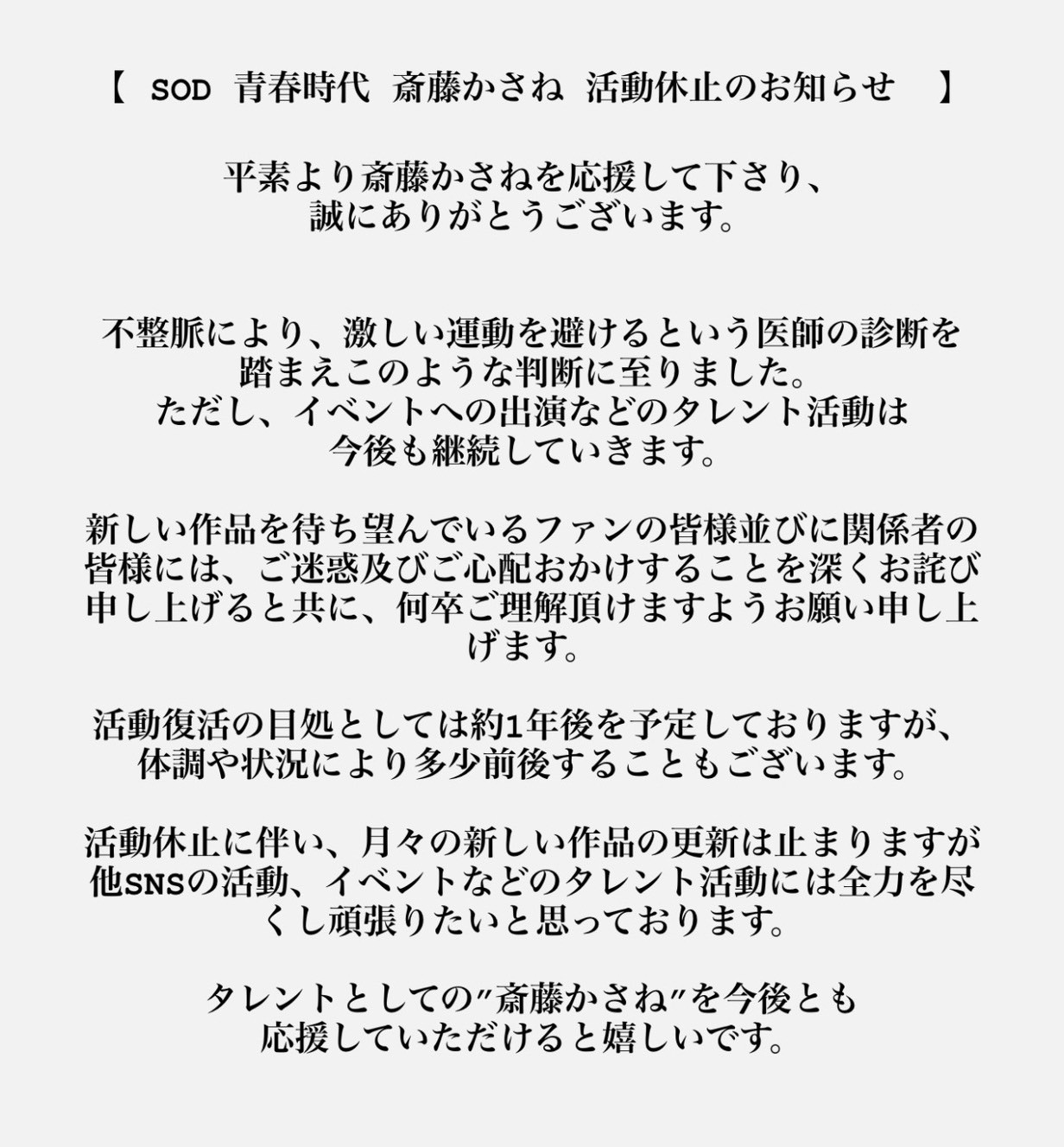 原因是身体不行了,因为心律不整无法剧烈运动,所以她只得暂停拍摄工作,预期要花一年左右的时间恢复健康ー这可真是不妙,明明才刚出道正是要好好努力的时候,结果齋藤かさね(斋藤花纱音)的身体却撑不住了,尽管她说会继续经营社群并且参加事务所的活动,但问题没有新作产出你就很难提升知名度,更何况几次活动看下来她的人气也有待提升〜