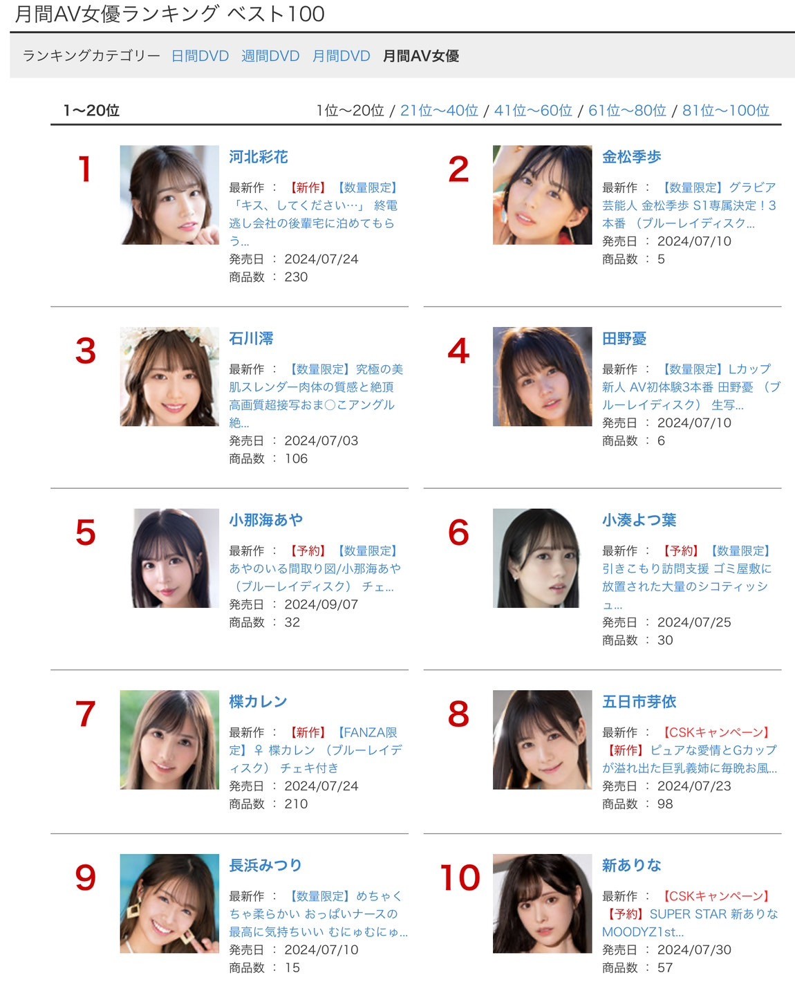 以上个月的FANZA月间AV女优排行榜来看,排名最高的企划女优是「小那海あや(小那海绫)」,接着是转专属女优的「五日市芽依」、然后分别是「森沢かな(森泽佳奈)」、「美园和花」、「都月るいさ(都月琉衣纱)」⋯那佐野ゆま(佐野由真)是排行第几呢?没查不知道,查了才知道真是出人意料: