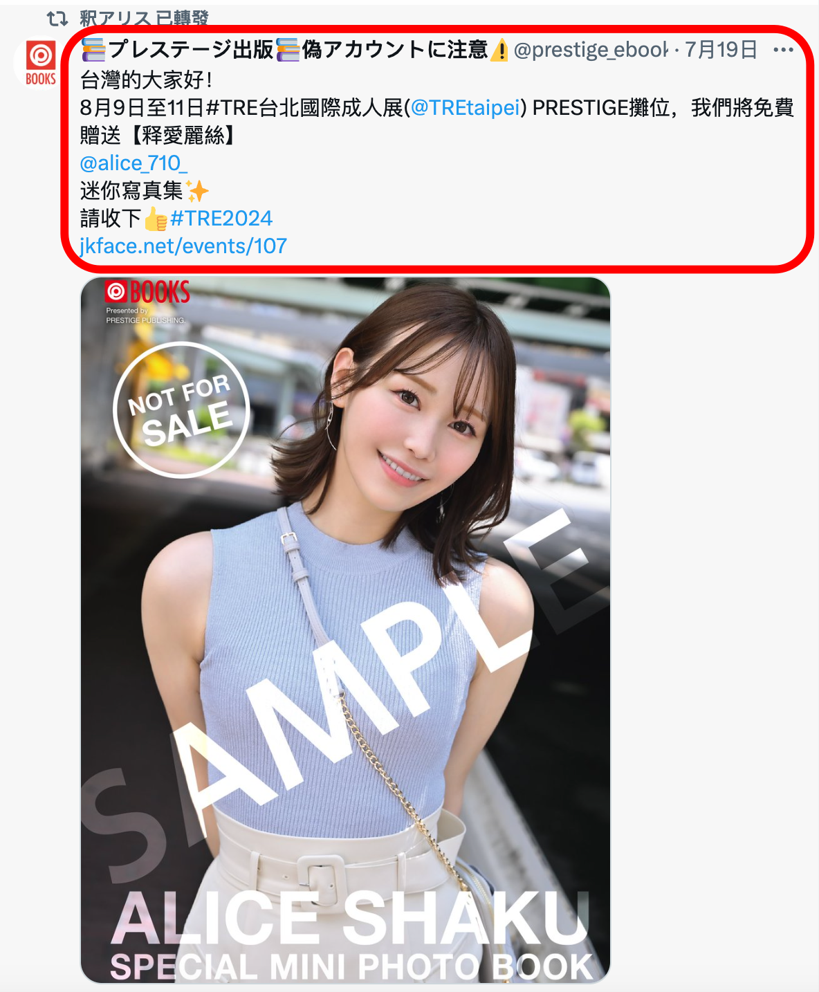 这本写真是有裸露的,Prestige也宣布在TRE举办期间到他们的柜台就会送上免费迷你写真集,请大家到时候记得去逛逛。然后最重要的问题来了,拍了写真又去了Presitge的摊位,釈アリス(释爱丽丝)会拍AV吗?
