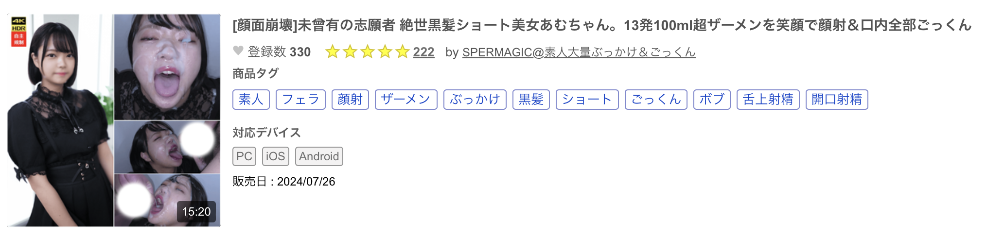 番号是FC2-PPV-4507571,简单说,这不是我平常介绍的FC2卖家作品,从卖家的名字「SPERMAGIC@素人大量ぶっかけ&ごっくん」以及作品的剧照你就知道这是一支大量颜射吞精的片子,是很癖好类、For喜欢女优被射得满脸全浆糊的影迷所拍的作品:很文博客-https://www.hinku.com/63907.html