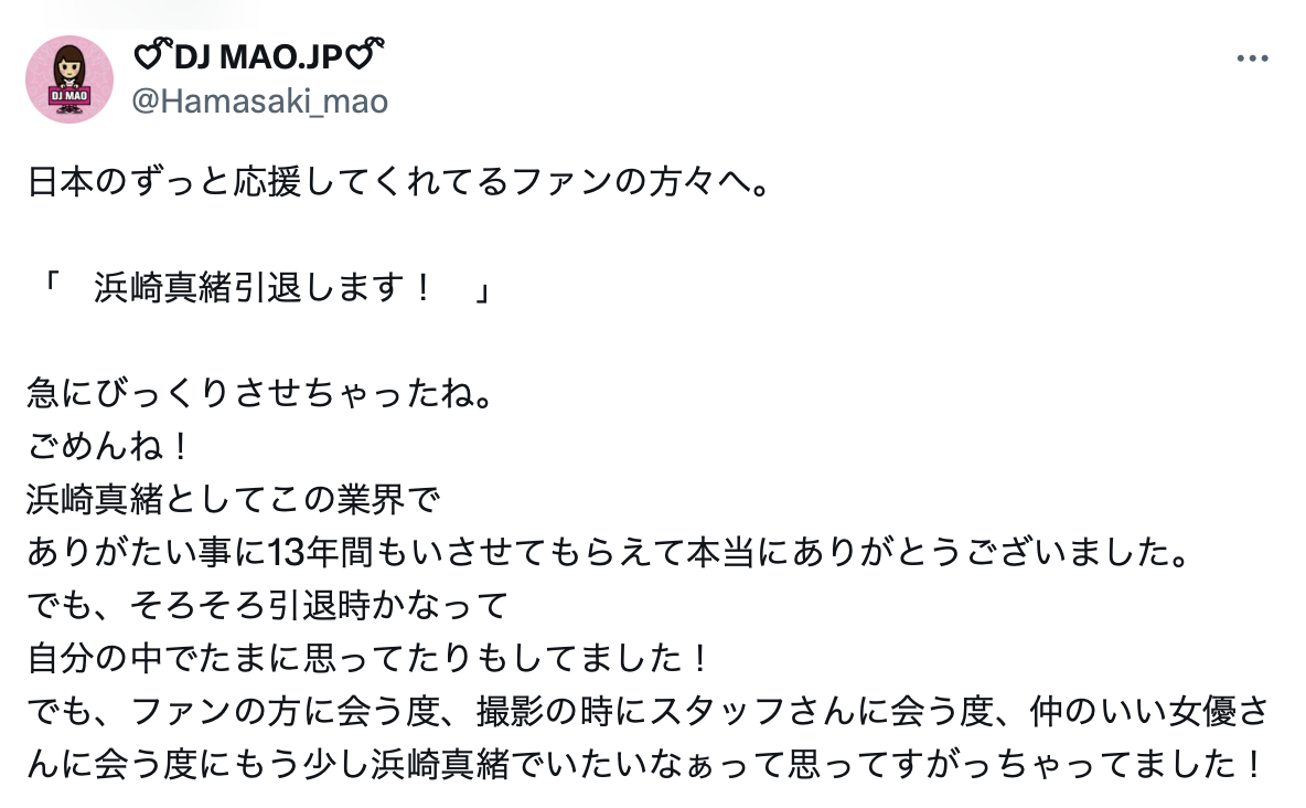 现场根本没时间问,更何况浜崎真緒(滨崎真绪)也不是我们摊位的来宾,突然冲去问也蛮失礼的;不过还好,到了晚上她就在自己的X(https://x.com/Hamasaki_mao/)上说明了:她说能以浜崎真緒(滨崎真绪)的名字在这一行待13年真的非常感谢大家支持,不过最近时不时地在想,好像是引退的时候了:很文博客-https://www.hinku.com/64169.html