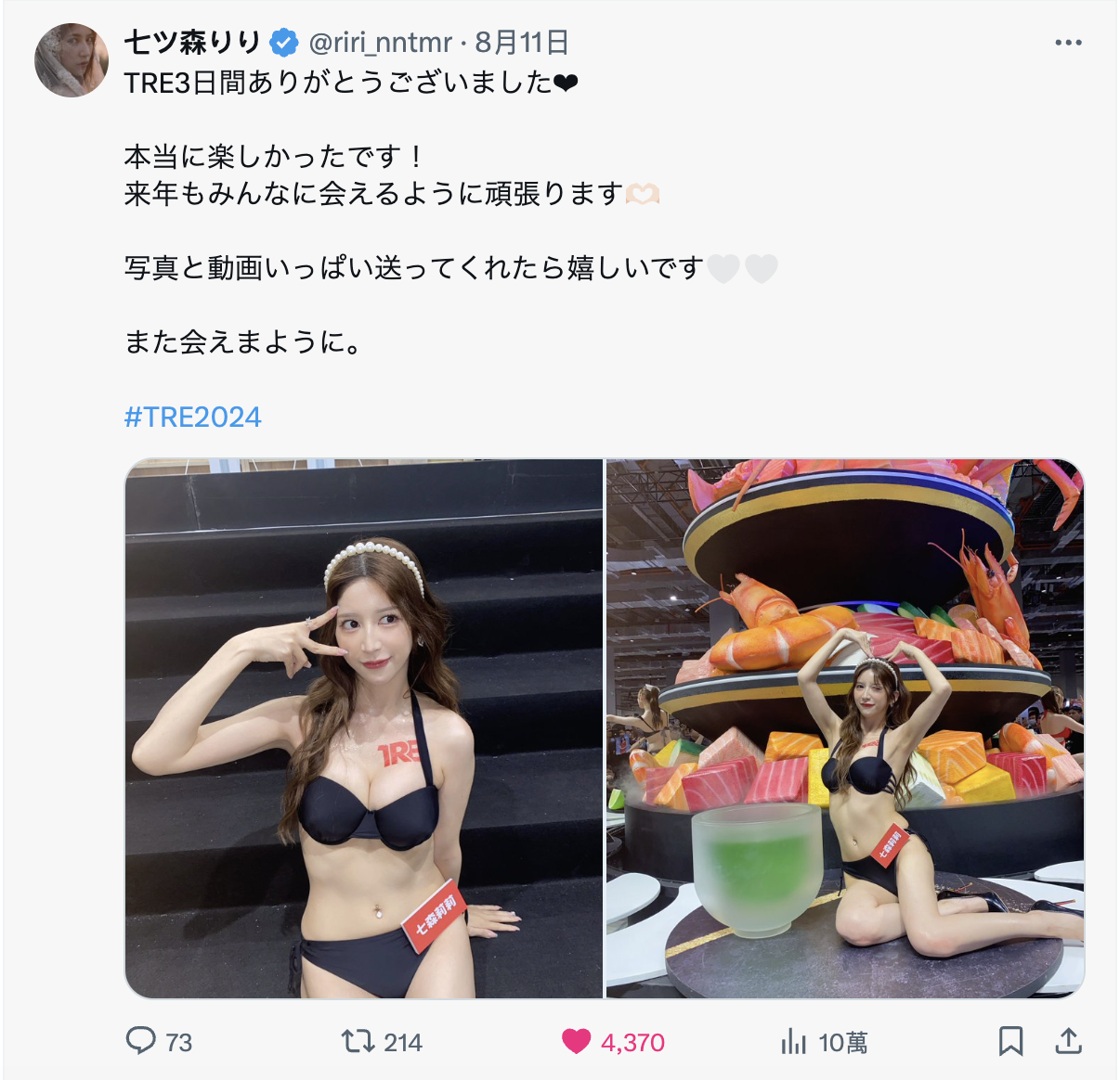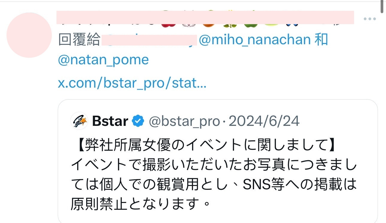 不过被人家一直靠北也很烦,所以我还是讲一下经纪公司对TRE期间的粉丝发文的看法:首先,从邀请女优到活动结束我们一次都没有听到经纪公司提出审核粉丝发文的要求,任何一间都没有;再来,如果不喜欢粉丝发文那女优应该一次都不会转推或是直接用粉丝拍的照片发文吧?但这段期间女优都转推得很开心,因为大家都知道可以趁着这个机会好好涨粉,不管是X还是IG,那么多美照涌入标记,比起女优自拍修图发个一两张照片有用太多了: