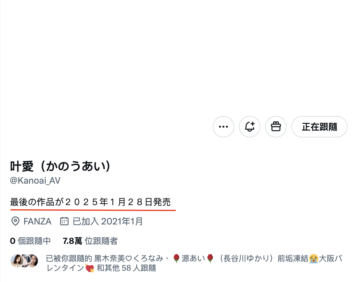 一片空白,只留下了自己的名字「叶愛(叶爱)」,其实要注意女优有没有出问题看她们的社群最快,长期不更新的可能只是想不出梗,但是像叶愛(叶爱)(https://x.com/Kanoai_AV)这样整片是白的或是帐号和名字都改掉的那就一定有问题了⋯很文博客-https://www.hinku.com/64337.html