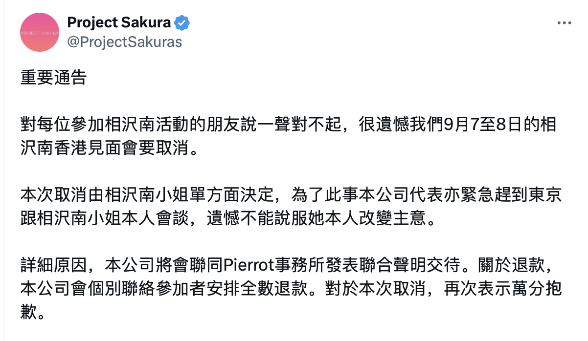 所以香港的主办单位也出文说活动是由相沢みなみ(相泽南)单方面决定不玩的,他们有想办法挽救但功败垂成,现在据说要提告其经纪;不过相沢みなみ(相泽南)不只取消他们的活动,凡是之前用相沢みなみ(相泽南)之名接下来的工作她通通推掉了,然后深感抱歉的她到最后是拜托未来如果以其他名字(目前X和IG改名为Minami)再出发时请大家继续支持,届时,她希望能打从心里展现笑容给每个粉丝看,最快,明年大家就会看到重新出发的她〜