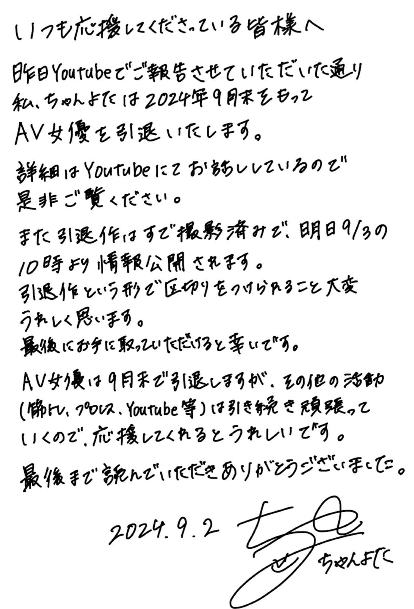 先是YouTube,再来是于X(https://x.com/sym_yok)发文,在AV界待了四年、以筋肉形象著名的ちゃんよた(Chan与田)宣布引退,女优的工作只做到9月底〜很文博客-https://www.hinku.com/64914.html