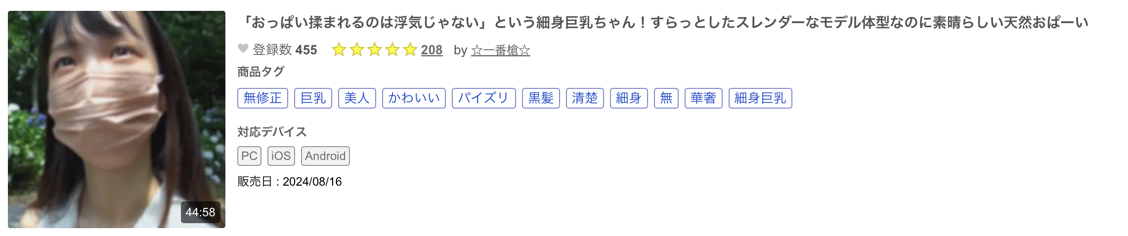 来看这支番号为FC2-PPV-4516449的作品『「おっぱい揉まれるのは浮気じゃない」という細身巨乳ちゃん!すらっとしたスレンダーなモデル体型なのに素晴らしい天然おぱーい』,这是一支女优大多数时间都戴着口罩演出的出鲍片,不过有没有脱口罩没差啦,除了模特儿的高挑细身体型和F罩杯的奶子外,神谷のこ(神谷乃子)有个超级好辨认的特征,就是左乳下方那块黑色的胎记〜