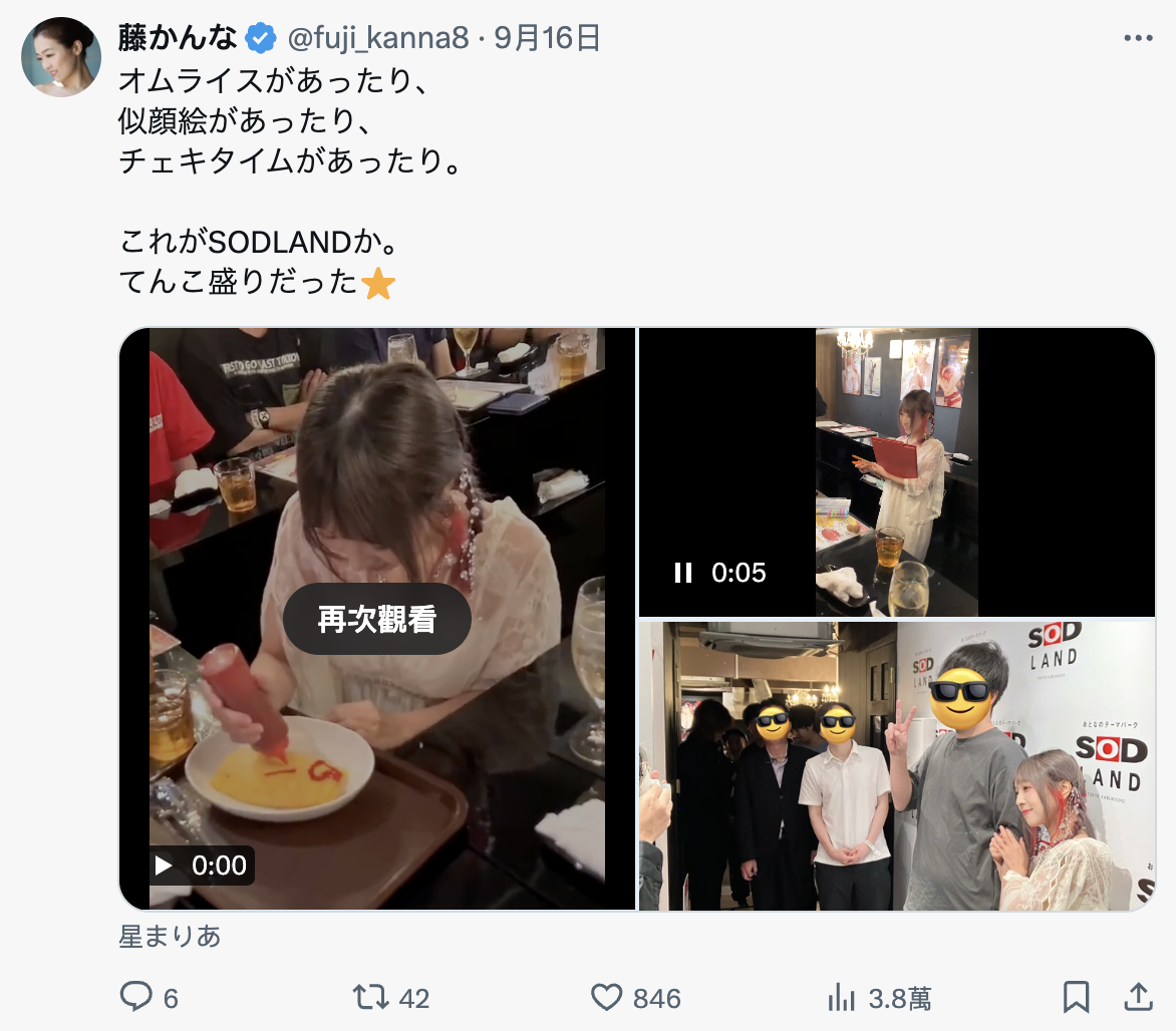 是真的「现身」了,她直接去了SODLAND举办活动,从藤かんな(藤环奈)的X(https://x.com/fuji_kanna8)就可以看到她的模样ー我觉得她好的不得了,脸蛋还是很可爱,发尾挑染酒红色的造型又甜又辣,很期待她的的回归;至于她露面做了什么呢?简单说就是贩售蛋包饭、周边商品然后陪粉丝喝一杯,基本上你买愈多就有愈多和她互动的时间…很文博客-https://www.hinku.com/65433.html