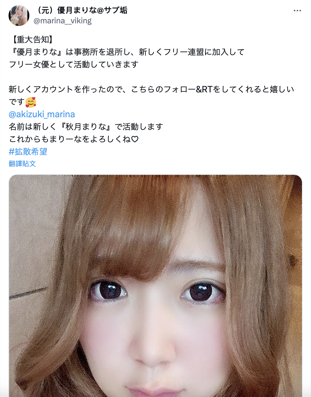 虽然不乏就地改名的例子,但大部分女优改名都是因为要更换事务所ー不过優月まりな(优月真里奈)的状况比较不一样,她直接讲了,因为要去「フリー连盟(自由联盟)」,所以自原先的经纪公司毕业了,现在要改名为「秋月まりな(秋月真里奈)」:很文博客-https://www.hinku.com/65449.html