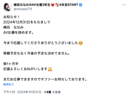 这次宣布引退的是在片商Madonna出道的「峰田ななみ(峰田七海)」,我们一块儿来看看她在X(https://x.com/mineta773)上写了什么:很文博客-https://www.hinku.com/66561.html