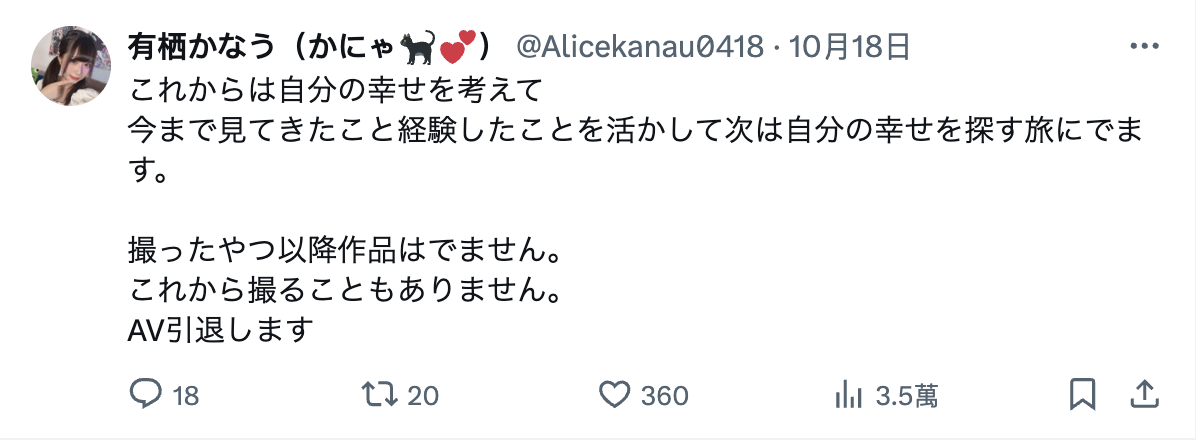 一块儿来看有栖かなう(有栖奏羽)在社群上的发文(https://x.com/Alicekanau0418),她在10月18日的时候是这么说的:很文博客-https://www.hinku.com/66637.html
