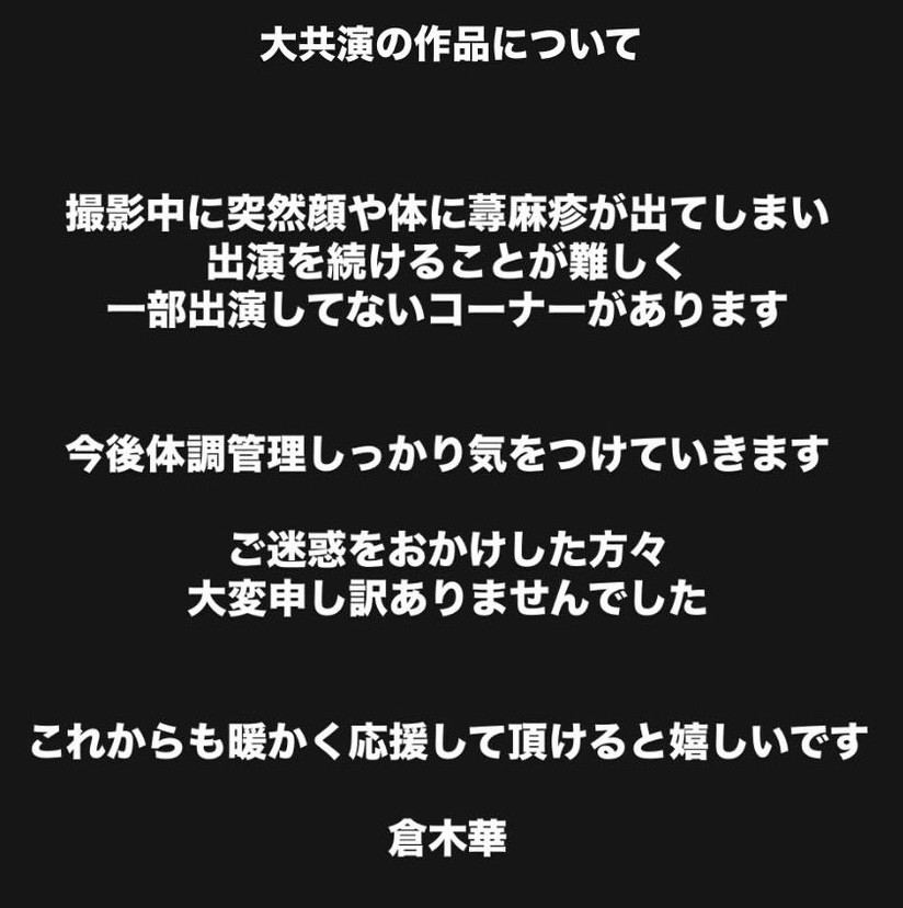 所以真相大白了,不是片商忘了把她演出的片段剪进去,而是她因为荨麻疹发作所以无法全程参与演出ー至于荨麻疹发作有多痛苦呢?倉木華(仓木华)是引用之前的发文,她说先是身体感到搔痒,接着视线也开始模糊,随后脸部剧烈的疼痛,根本拍不下去⋯