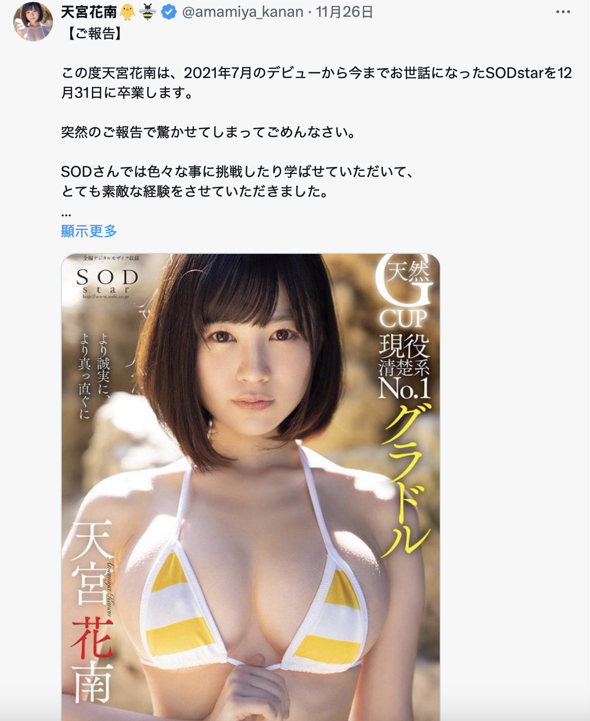 答案是她要自SOD Star毕业了ー2021年7月出道的她就做到12月31日,也就是说从2025年开始她就再也不是SOD Star的人了,回首这三年多来的合作,她说自己尝试了许多挑战也学到了很多,是相当美好的经验⋯