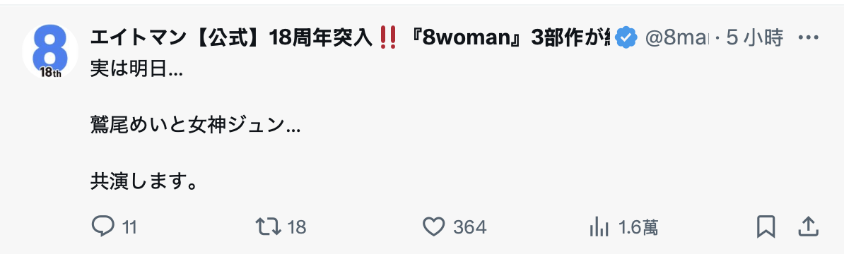 最爱爆料的事务所エイトマン(8MAN)是在官方X(https://x.com/8manpro)揭露了这个震撼的消息ー今天(11/28),鷲尾めい(鹫尾芽衣)要和女神ジュン(女神纯)共演〜很文博客-https://www.hinku.com/67474.html