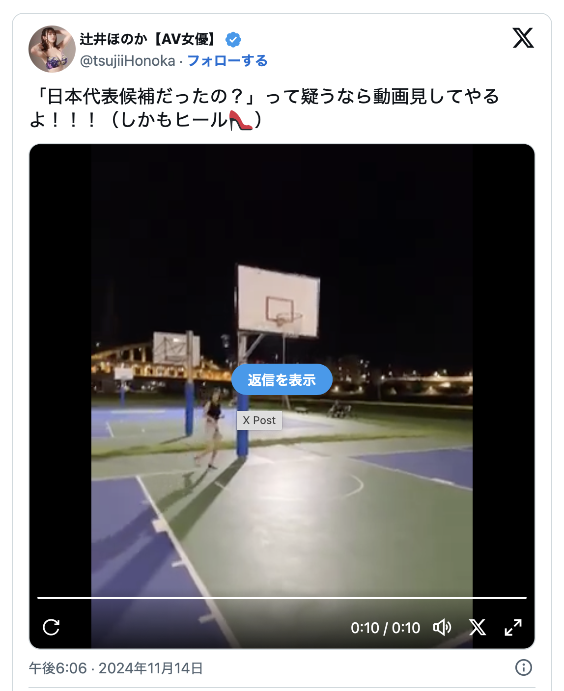 看了这支作品就知道,穿者运动服的辻井ほのか(辻井穗乃果)真是迷人,而且在球场上的基本动作也不含糊,也难怪片商敢说她有入选国家队的实力;如果你懒得去找这支作品的话,没关系,我们直接去看她的社群,这边有她小人物上篮的影片: