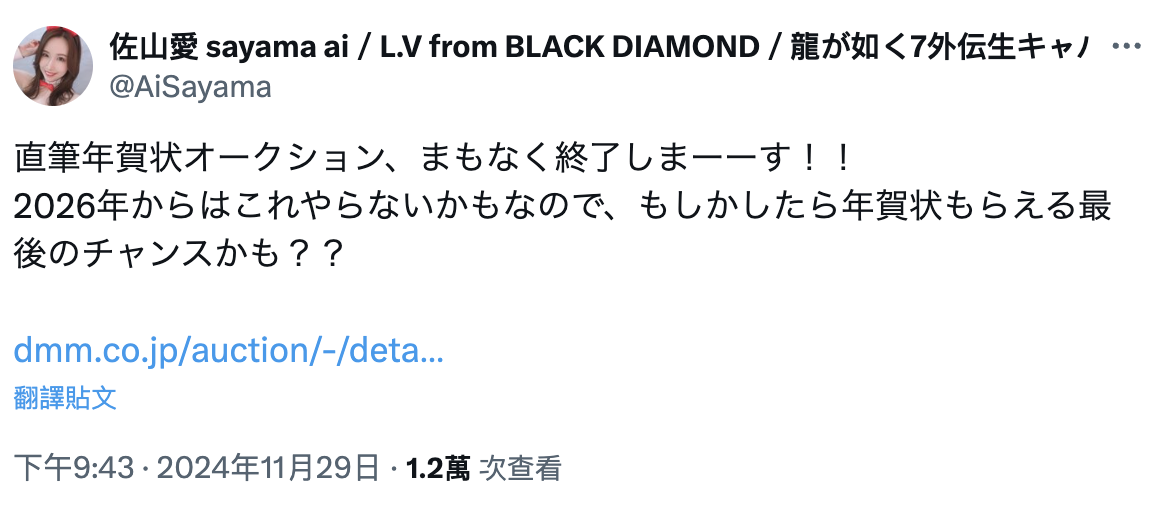 因为有一篇翻译的文章在网路流传,说佐山愛(佐山爱)将会在明年的1月1日宣布引退,告别作将会在9月发行ー由于她在X(https://x.com/AiSayama)上有说明年可能不会再参加亲笔写贺年信的活动了,所以这个引退宣言看起来是有几分可信度的〜很文博客-https://www.hinku.com/67658.html