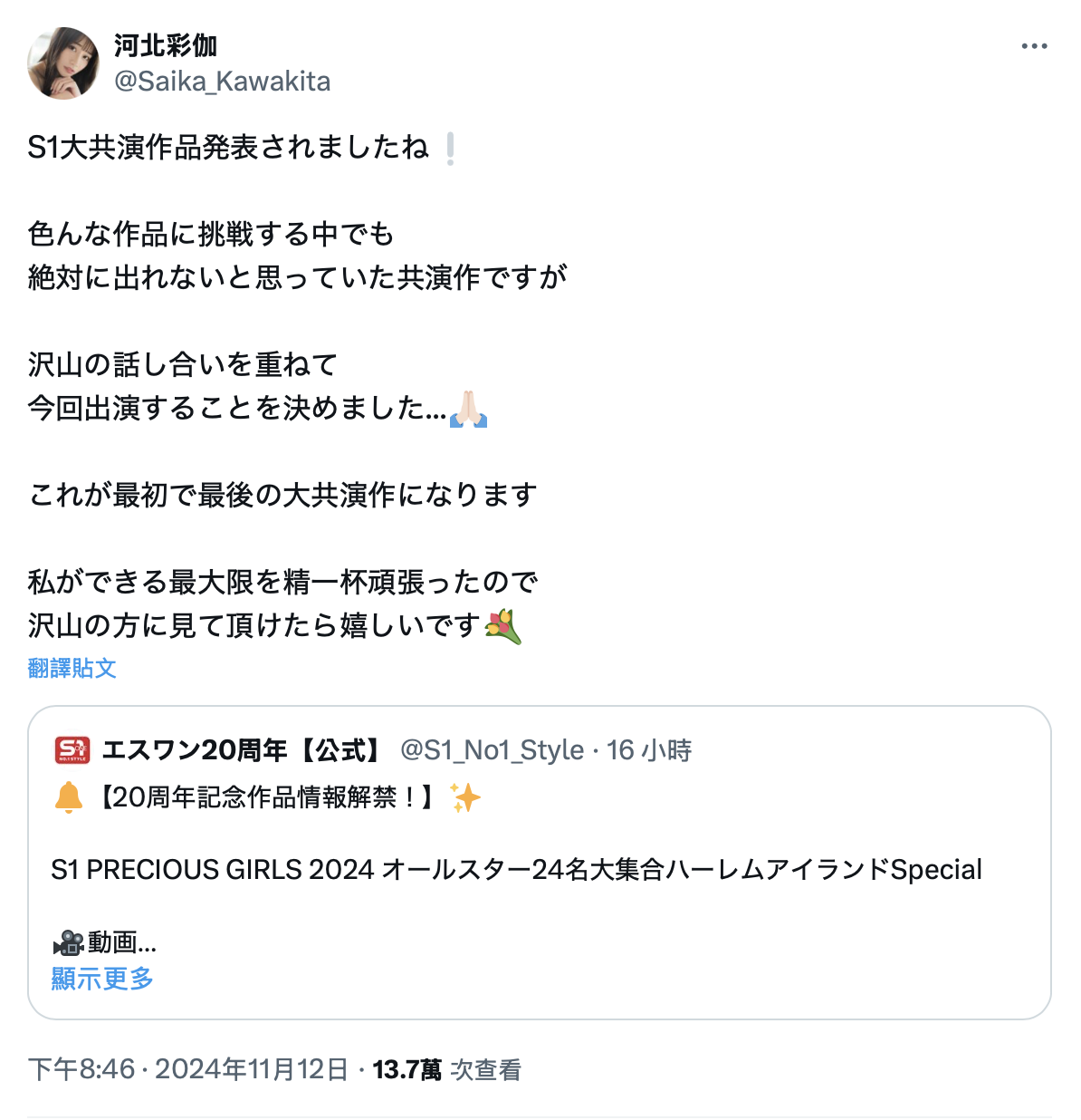 这肯定会引发一些讨论的,可能有些人会讲的不太好听,而我的看法是这是片商以及河北讨论很久后的结果ー河北彩伽在社群讲的完全没错,共演团战从来就不在她想挑战的范围内,而且不是演完以后浑身不舒服,是一开始就对打团战这事过敏,但因為20周年纪念作实在太重要,身為片商一姐以及业界代表女优的河北彩伽如果没参与这支作品会很怪,於是双方应该花了不少时间沟通: