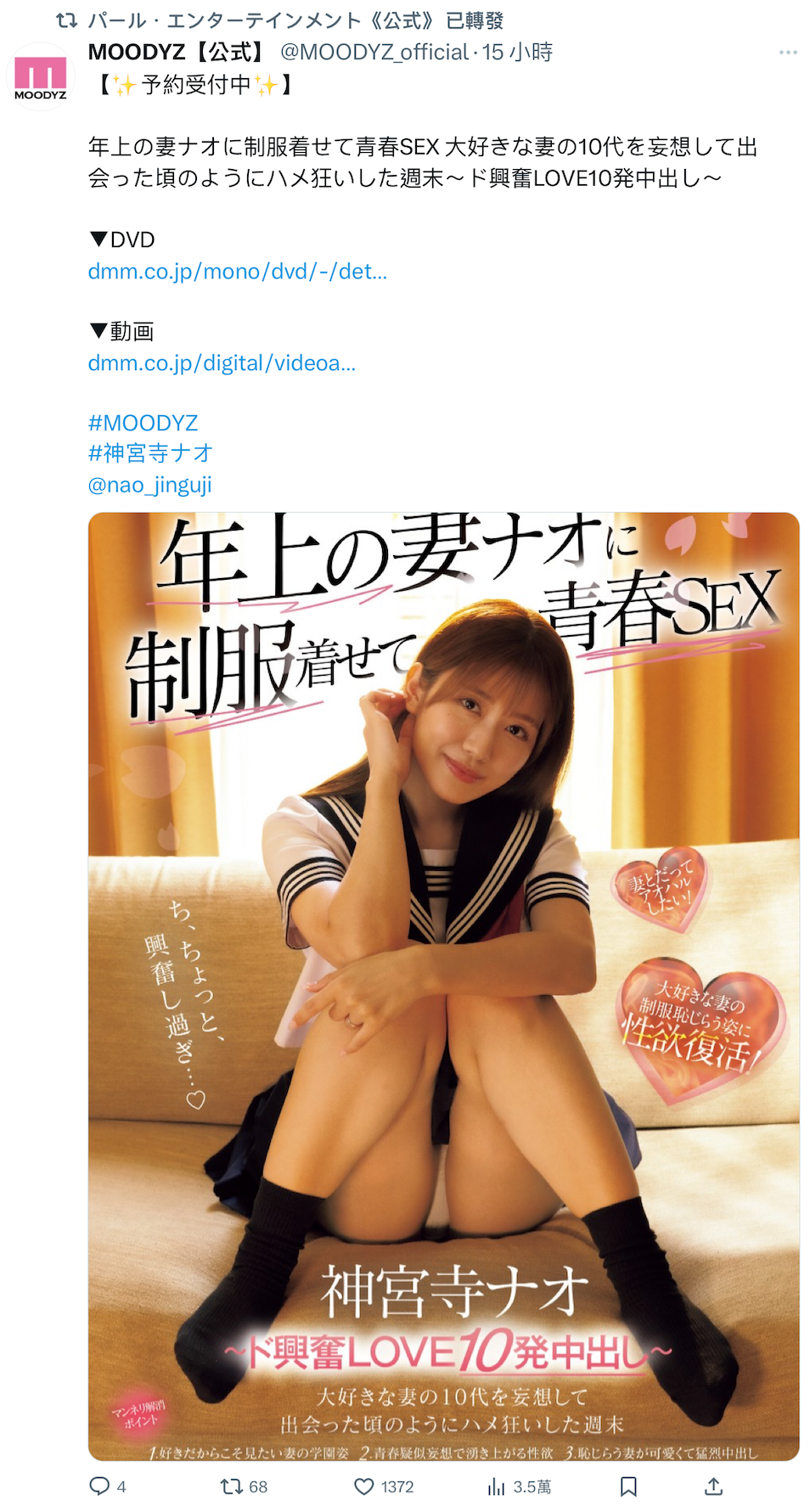 一般来说要看女优隶属那间事务所,看她们X追踪谁就有答案,但这点偏偏不适用于神宮寺ナオ(神宫寺奈绪),她只追Moodyz和Madonna两间片商,另外一个办法就是看哪一间事务所转发神宮寺ナオ(神宫寺奈绪)的社群发文,这时候你就会发现有一家新的事务所「パール・エンターテインメント」(Pearl Entertainment,X为https://x.com/pearl_recruit):