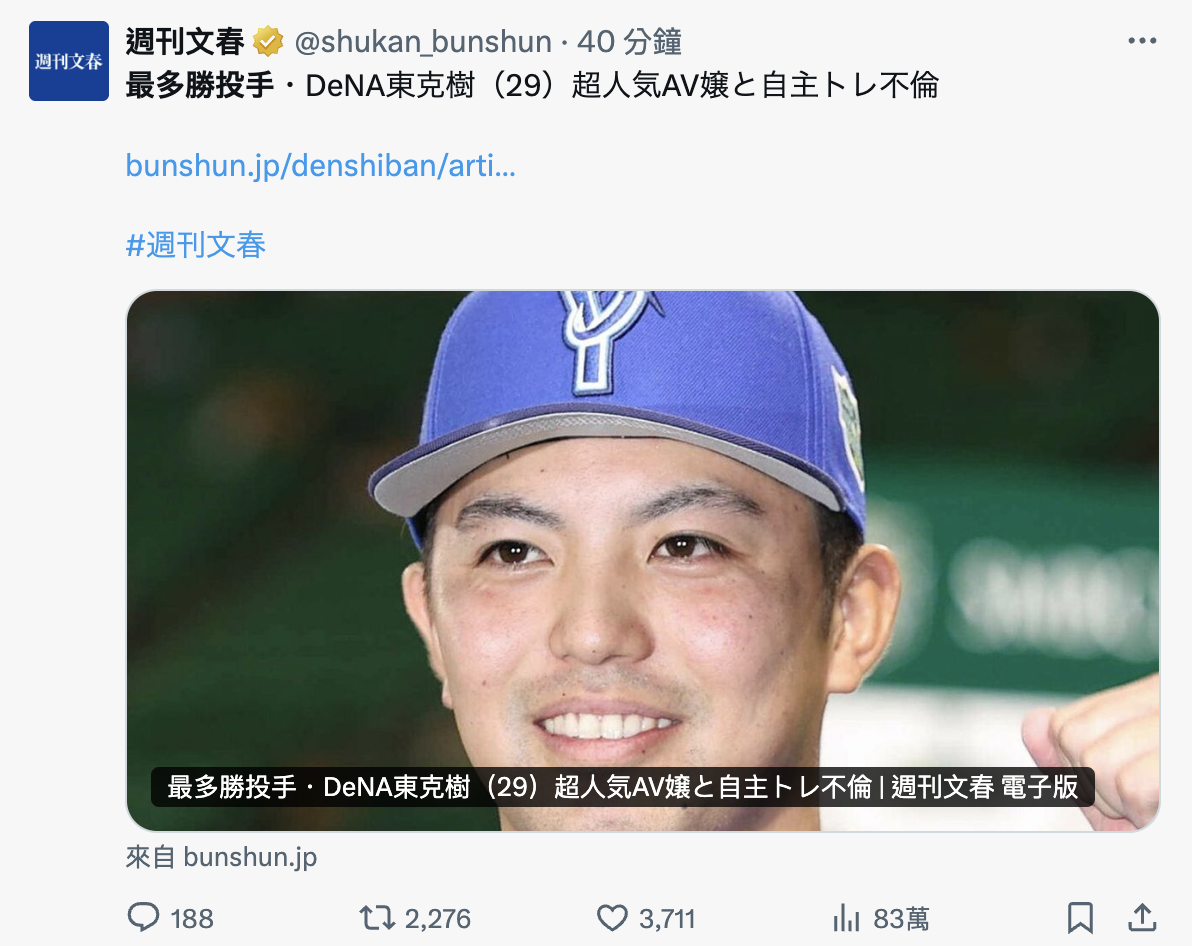 最多胜投手和AV女优的不伦,光看这标题就觉得很有爆点ー而在昨天晚上,已经有不少人注意到横浜DeNA的投「东克树」个人的X消灭、IG也退光了所有追踪而且还不准留言,更巧的是他正是2023年中央联盟的最多胜投手,当年他拿下了16胜⋯很文博客-https://www.hinku.com/69117.html