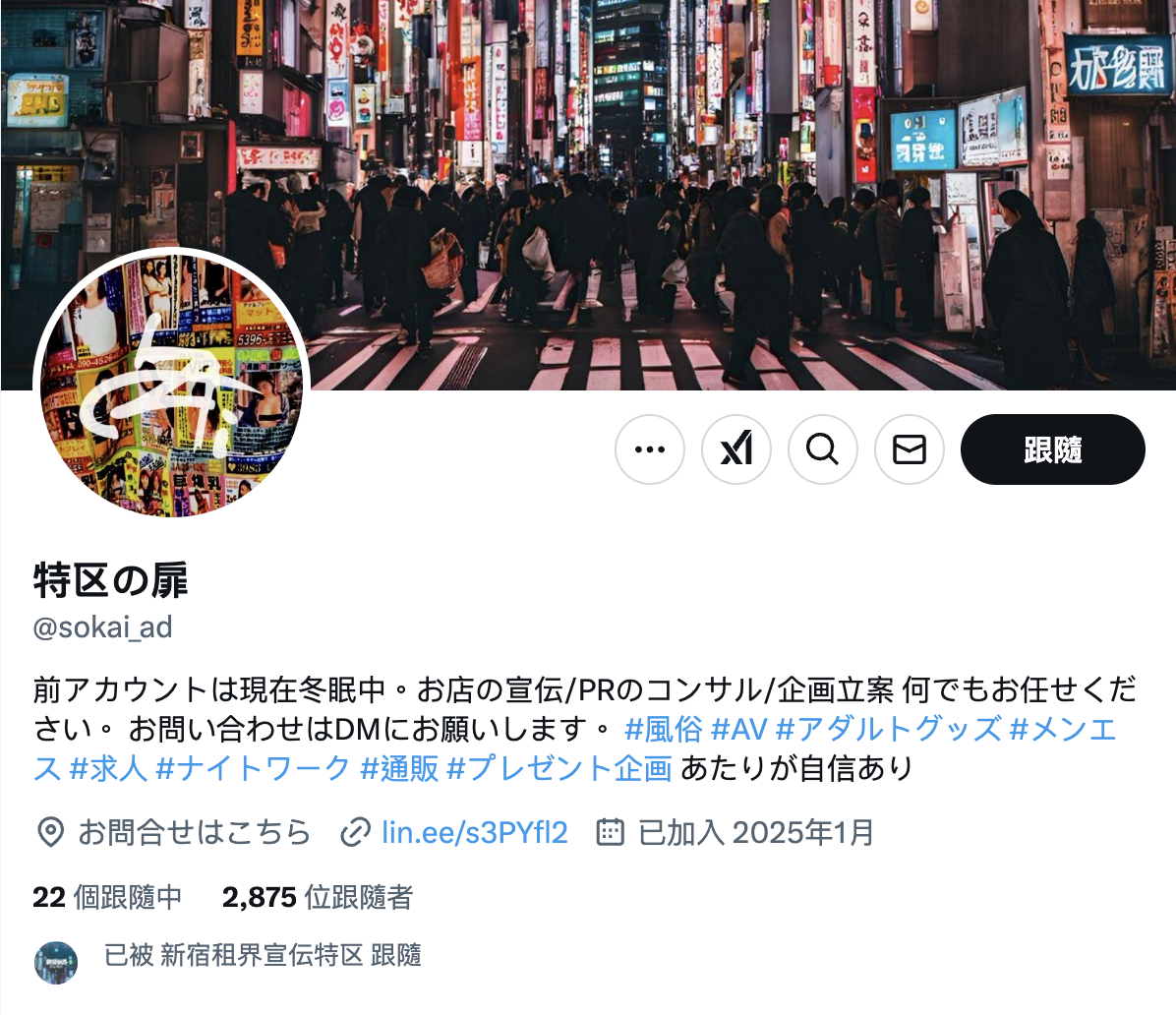 目前帐号的ID已经更改为「https://x.com/sokai_ads」,使用者名称叫做「新宿租界宣伝特区」ー很文博客-https://www.hinku.com/69289.html