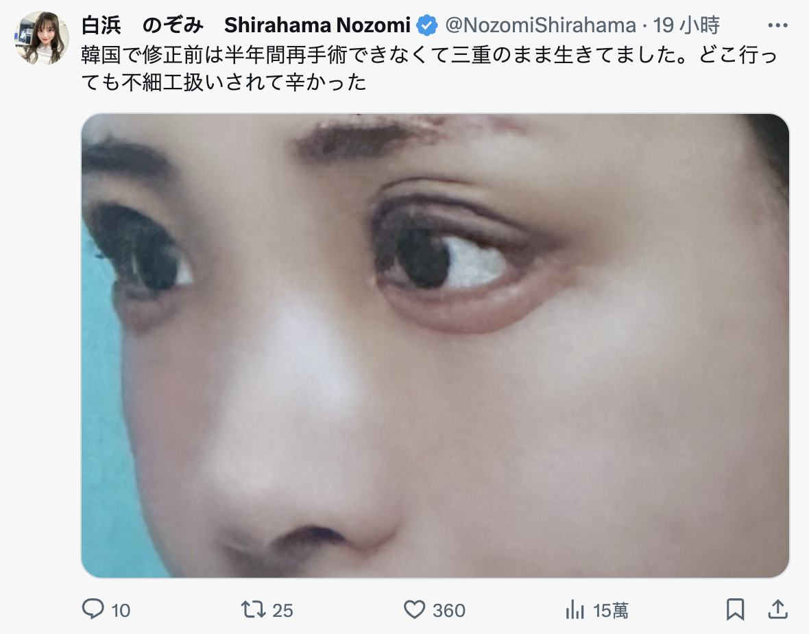 就是「整形失败」,一年前她在银座一间超有名的整形医院进行手术,由于是指名院长动刀还要加付25%的费用,结果手术失败了ー虽然后来手术费有退还,但从此她就陷入了手术修补然后再度失败的恶性循环,眼睛的部分最惨,五次手术通通失败,让她没办法继续工作,粗估损失在1000万日币⋯