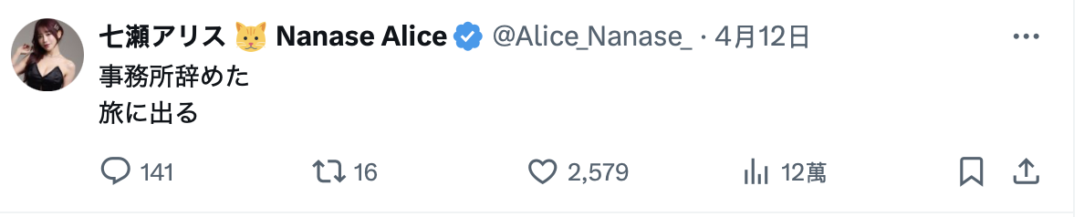 七瀬アリス(七濑爱丽丝)是在自己的X(https://x.com/Alice_Nanase_)这么写的:「我辞职了,要去旅行了。」很文博客-https://www.hinku.com/72458.html