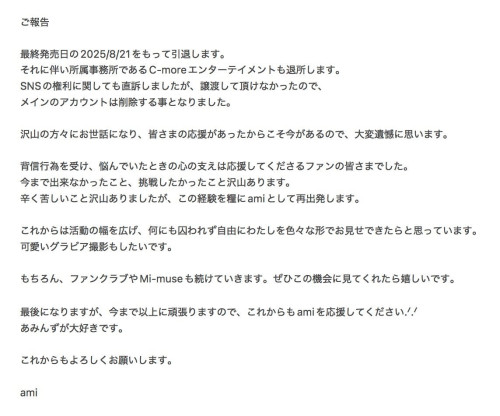 在拋弃原有艺名并且要求大家追踪自己的新帐号(https://x.com/ami__t1010)后,時田亜美(时田亚美)终于发表声明说明一切,8月21日,最后的作品发表后她就要引退了:很文博客-https://www.hinku.com/73029.html