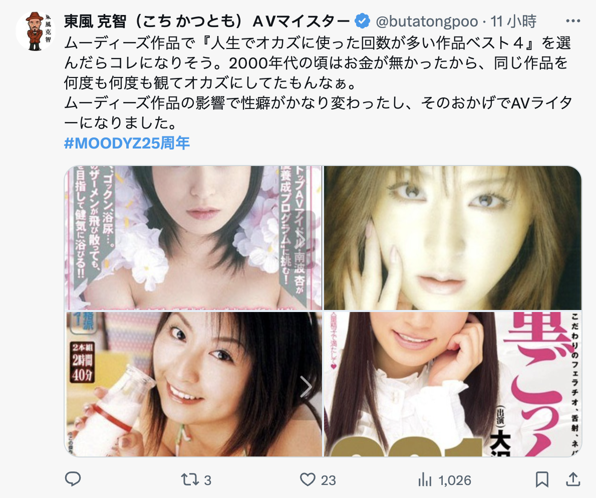 然后会有什么庆祝活动呢?在昨天,Moodyz宣布邀请八木奈々、石原希望以及葵いぶき(葵伊吹)拍摄YouTube的影片,大家可以先追踪他们的频道(https://www.youtube.com/@moodyz6109);知名写手「东风克智」也在X写下Moodyz史上自己印象最深的四支作品,他说这些作品改变了自己的性癖,也让他立志要成为AV作家~