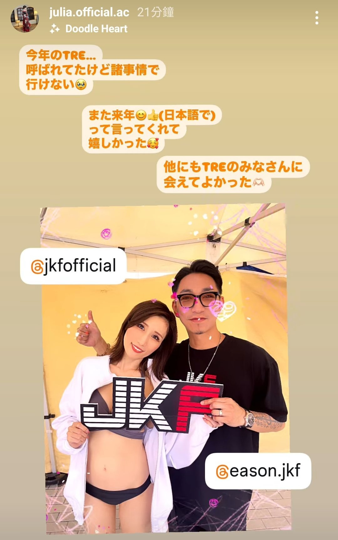 这是她放在IG(https://www.instagram.com/julia.official.ac/)限动的发文,重点是第一句,Julia说自己今年是有收到邀约的,不过因为各种原因未能成行…很文博客-https://www.hinku.com/73496.html