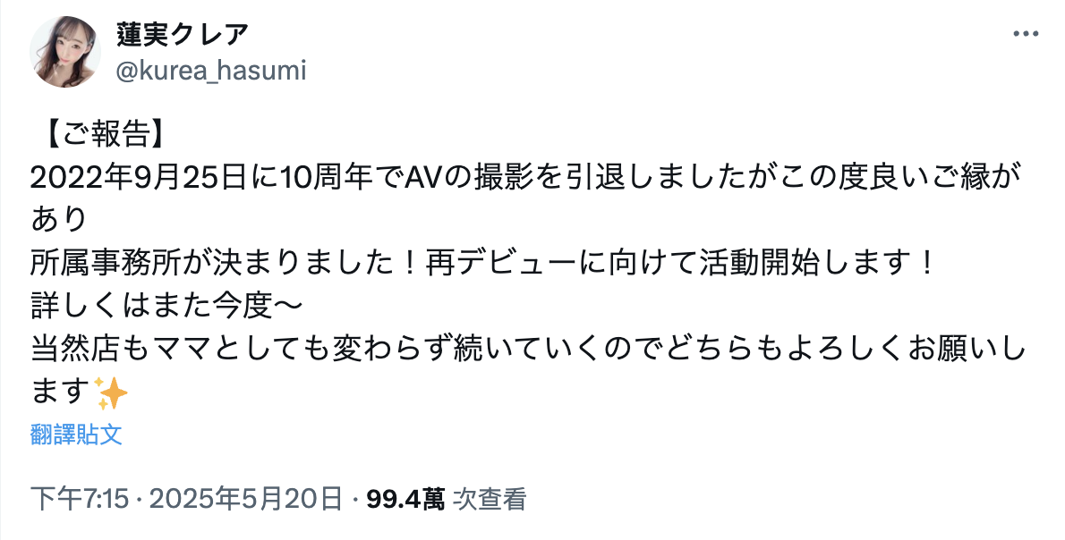 这样讲就不用怀疑了,蓮実クレア(莲实克蕾儿)的新事务所就是AV界的经纪公司,而她的「再出道」以及「展开活动」说的也是AV女优的工作,虽然目前没有办法和大家讲清楚,不过有两件事是确定的: