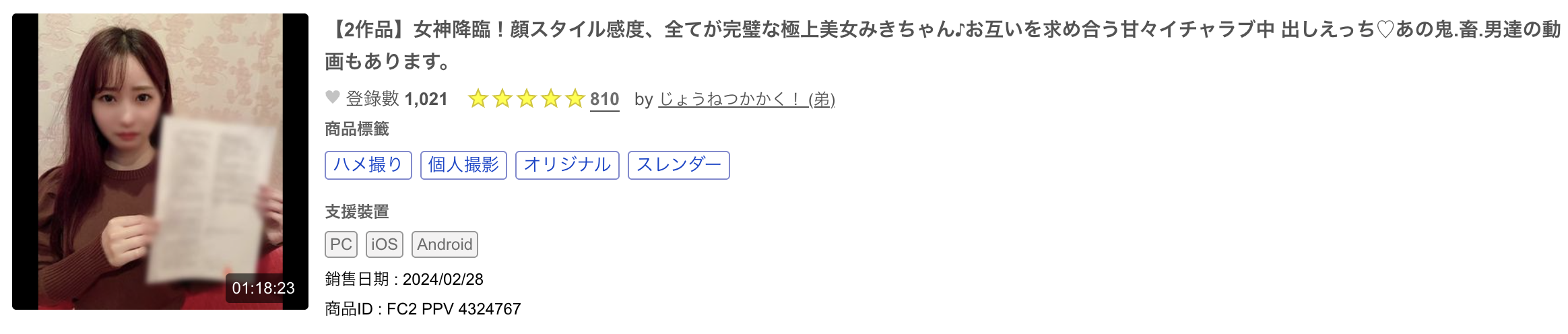 这两支是她转生为美織あん(美织杏)后,在FC2的平台上还找得到的商品(注,在撰写这篇文章的时候fc2-ppv-4324767这支作品已经下架),透过右边脸颊上的痣、长相以及乳型就可以确定演出这两支作品的下马人就是美織あん(美织杏),然后她该做的事都做了,露脸、出鲍、中出,一支无码片该有的元素这两支作品都有⋯