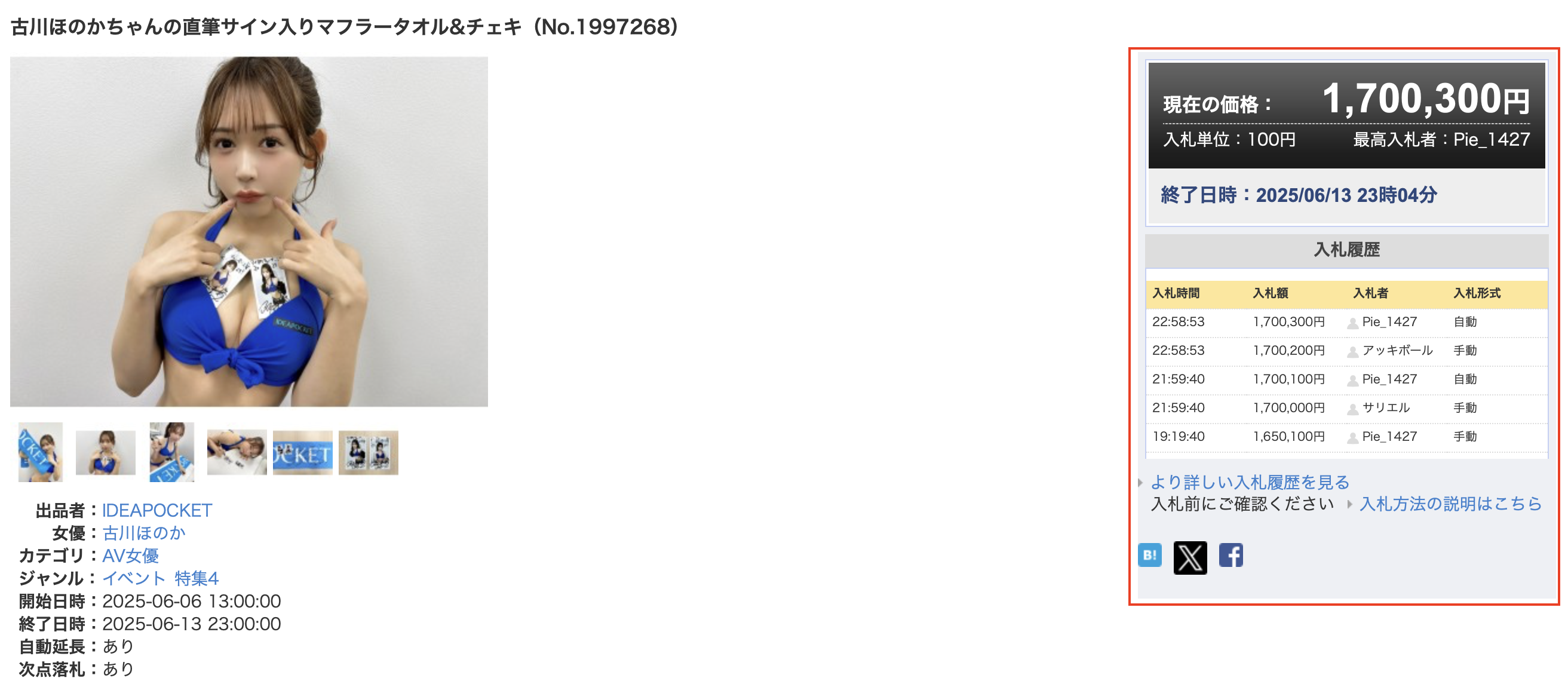 所以如果不是超人气、就是古川ほのか(古川穗花)至少有两位很有钱的粉丝互相较劲把价格抬了上去,我看了一下,主要是有4位粉丝参与了这场战斗,你说卖的是内衣也就算了,一条毛巾加两张拍立得用这价格结标真吓人,也不禁让人觉得奇怪,这么优秀的美少女怎么一直没有海外活动?