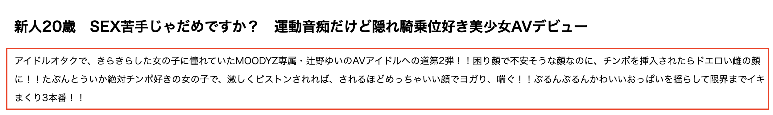 然后Moodyz就犯了大错,他们把夏色みか(夏色美香)出道作的文案误植为另一位新人「辻野ゆい(辻野唯)」的第二支作品,这是很严重的失误(而且到现在还没更正);不过还好,因为是新人所以片商都会把剧照上字,所以要了解夏色みか(夏色美香)并不难,我们首先要了解的就是她运动白痴到了什么程度,马上来看个明白:很文博客-https://www.hinku.com/76514.html