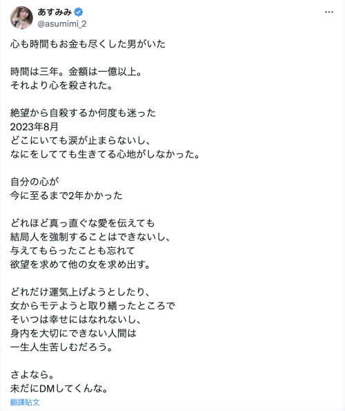 明日见未来(现在在X已经改名为あすみみ了)就告诉大家,过去两年她是碰到了什么状况:她说之前有个让她耗尽一切心力、时间和金钱的男人,在过去的三年,让她花了超过一亿日圆,她付出了这么多,换来的是「心被摧毁了」:很文博客-https://www.hinku.com/77253.html