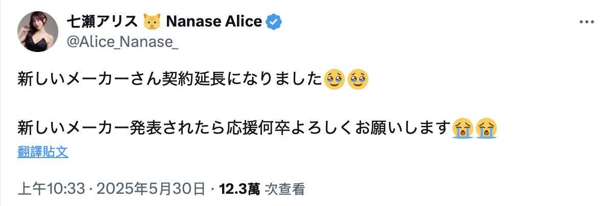 这说法怪怪的对吧?既然是新片商,怎么会是延长契约?所以我想七瀬アリス(七濑爱丽丝)的意思是她的专属契约延长了,但要换片商了ー果然,昨天,她就在X(https://x.com/Alice_Nanase_)上说清楚讲明白了〜很文博客-https://www.hinku.com/78412.html