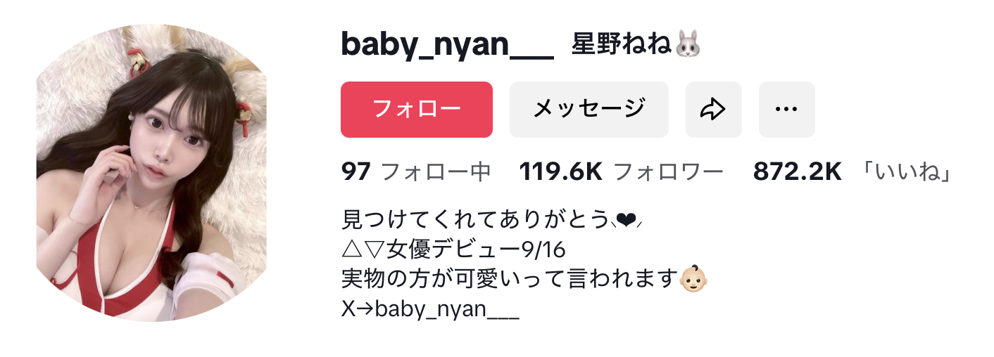 因为怕你不信,所以片商附上了她的Tiktok帐号(https://www.tiktok.com/@baby_nyan___),确实是个接近12万追踪的网红,而且还很贴心地附上了艺名ー没错,她叫做星野ねね(星野宁宁),虽然透过这个艺名你还可以找到她的X和IG,虽然追踪没有TIktok多,不过从上传的自拍照和短影音来看她就是个标准的网红脸,而且,身材还不错呢:很文博客-https://www.hinku.com/78618.html