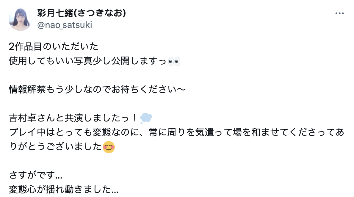 可能有人觉得这个外型看起来很猥琐的欧吉桑吃真好,不过他与彩月七緒(彩月七绪)是有些渊源的:虽然双方并不是在出道作就合作,不过在第二支作品合作的时候双方都留下的不错的印象,彩月七緒(彩月七绪)还特发文呢:很文博客-https://www.hinku.com/79765.html
