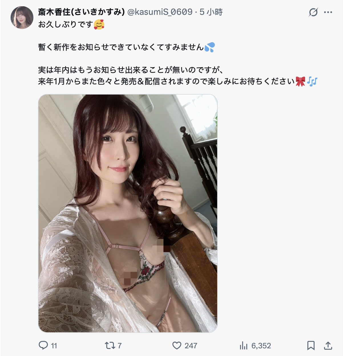 这个意思就是,斎木香住(斋木香住)应该不再是KANBi的专属女优,接下来要成为企画单体女优了ー为什么这么说?因为专属女优就是一片一片发,不会用「来年1月からまた色々と発売&配信されますので楽しみにお待ちください」(明年1月开始会有各式各样的作品发售及在串流平台配信),那明显是有大军压境,片子会很多很多,那不是专属女优发片的形式: