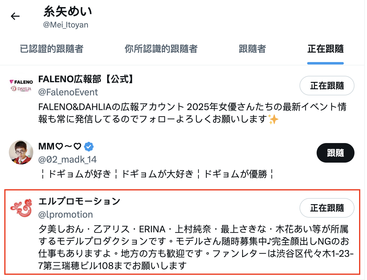 她,还是糸矢めい(糸矢芽衣),所以可以确认了,之前用化名「出道」随后中出し解禁是为了吸引大家注意,等到时机成熟她就恢复原本的身份ー同一时间她的X(https://x.com/Mei_Itoyan)也做了调整,糸矢めい(糸矢芽衣)的名字出来了,在追踪列表中也看到了エルプロモーション(L Promotion):很文博客-https://www.hinku.com/80323.html