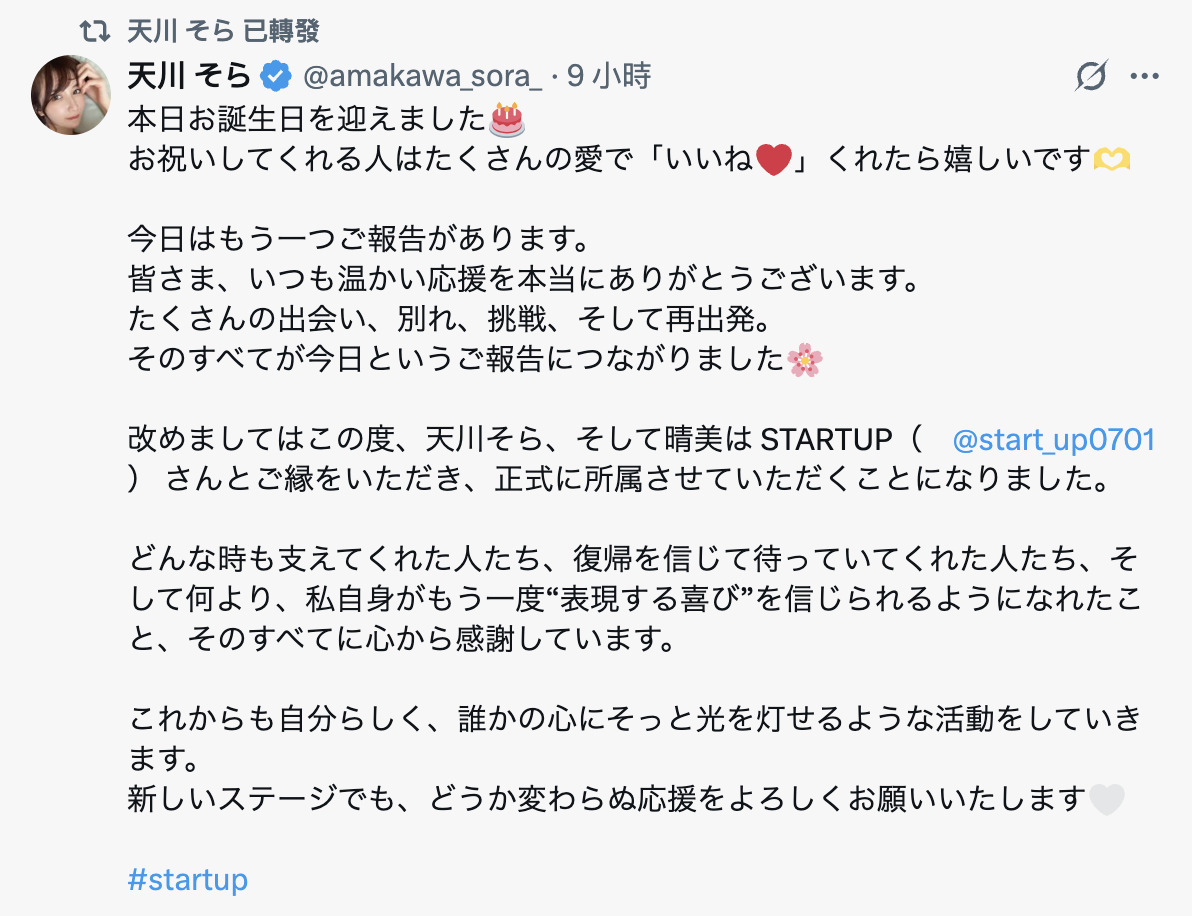 这就是这篇文章要告诉大家的:我们马上来看STARTUP的官方X(https://x.com/start_up0701),上面的自我介绍有说这是一间7月1日才成立的事务所,目前正在寻找志同道合的伙伴ー而到目前为止,除了天川そら(天川空)和京本晴美二人组外,还有已经引退的桜もこ(樱萌子)和まひる(樱茉日)也和这家经纪公司签约,接下来还有一位女优等着公布情报,也就是说这家AV事务所目前是有5位成员(桜もこ有说自己是以网红身份加入,所以她不会拍A片):